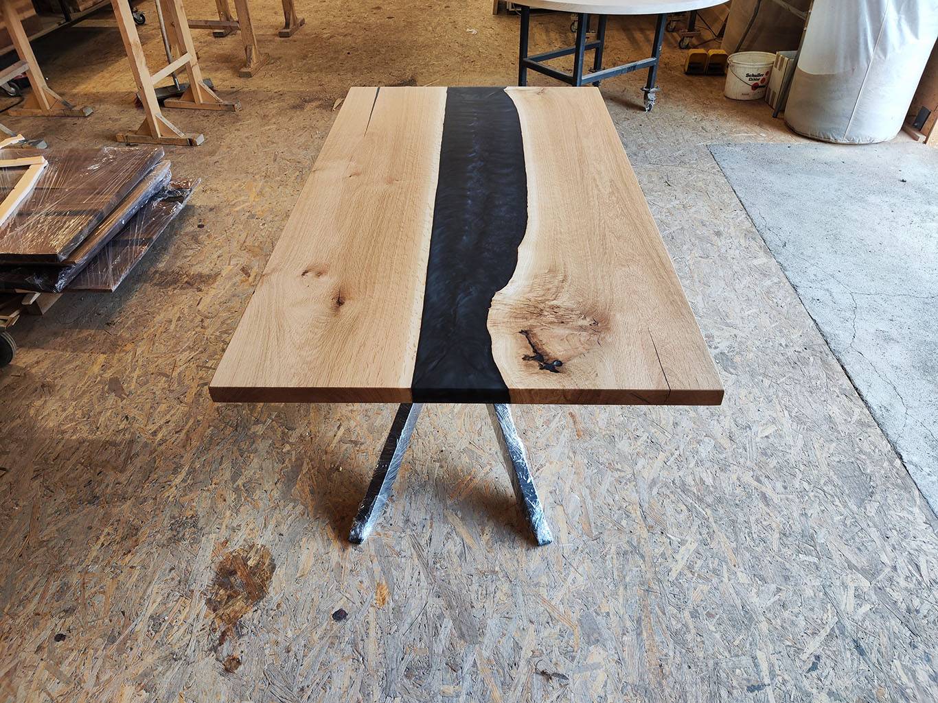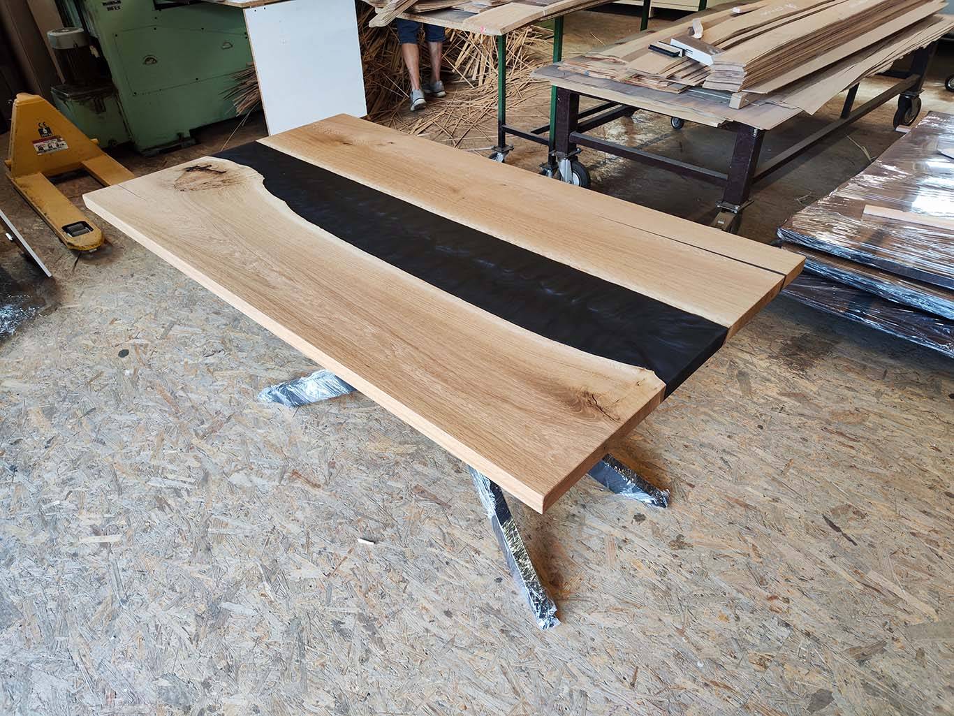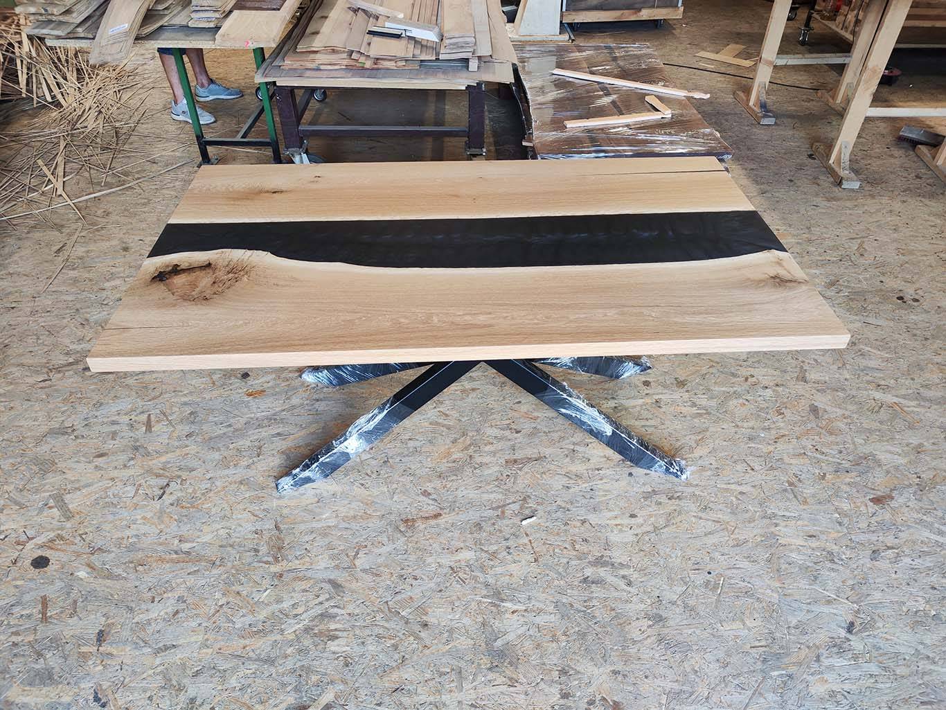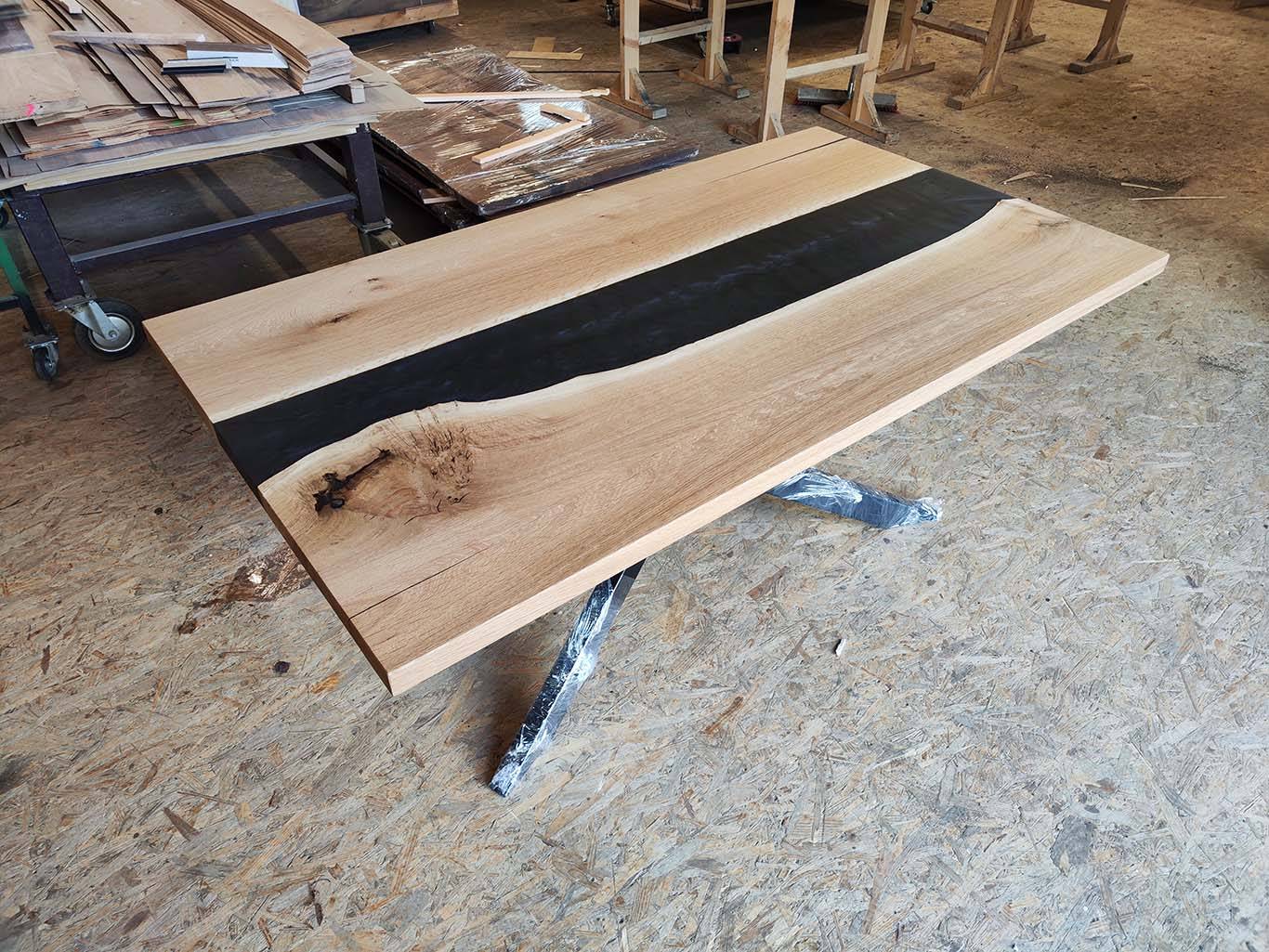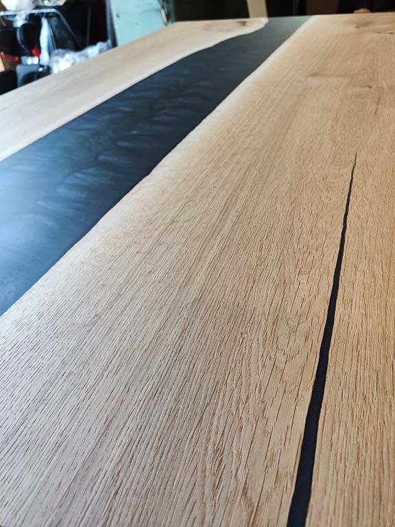 Masivna jedilna miza iz lepljene plošče hrast z dodatkom epoksi smole.