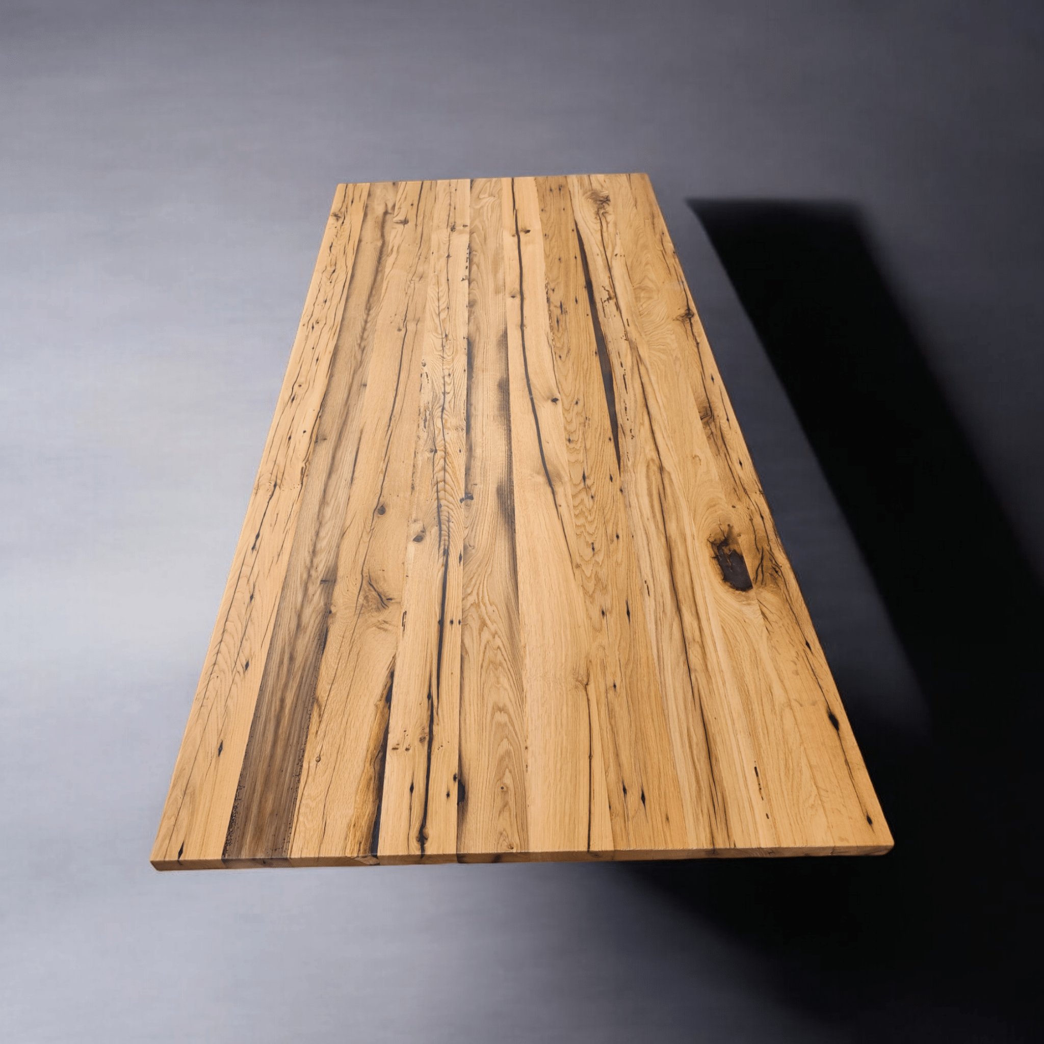 Masivna jedilna miza iz lepljene plošče hrast iz starih tramov, zalita z epoksi smolo, rahlo krtačena in lakirana