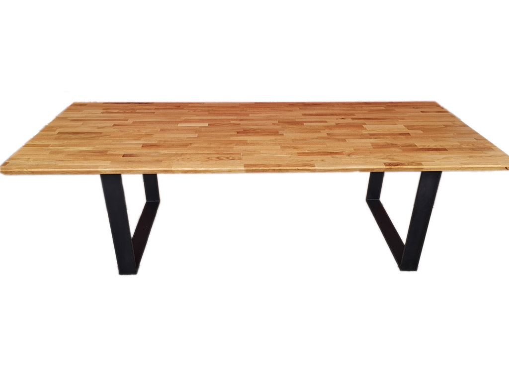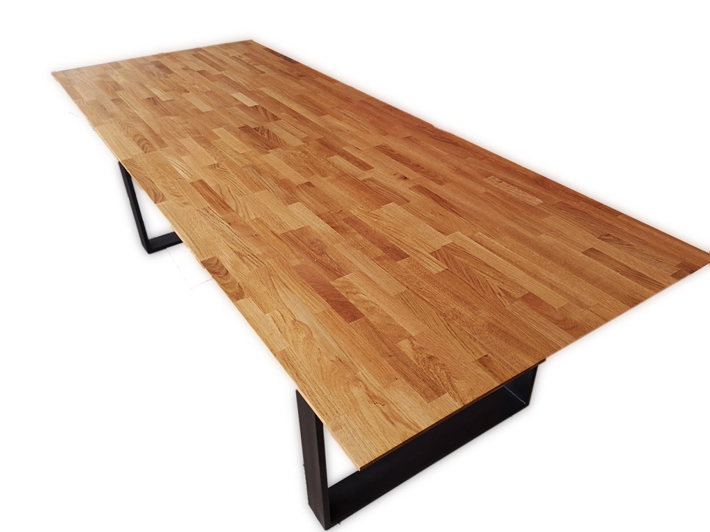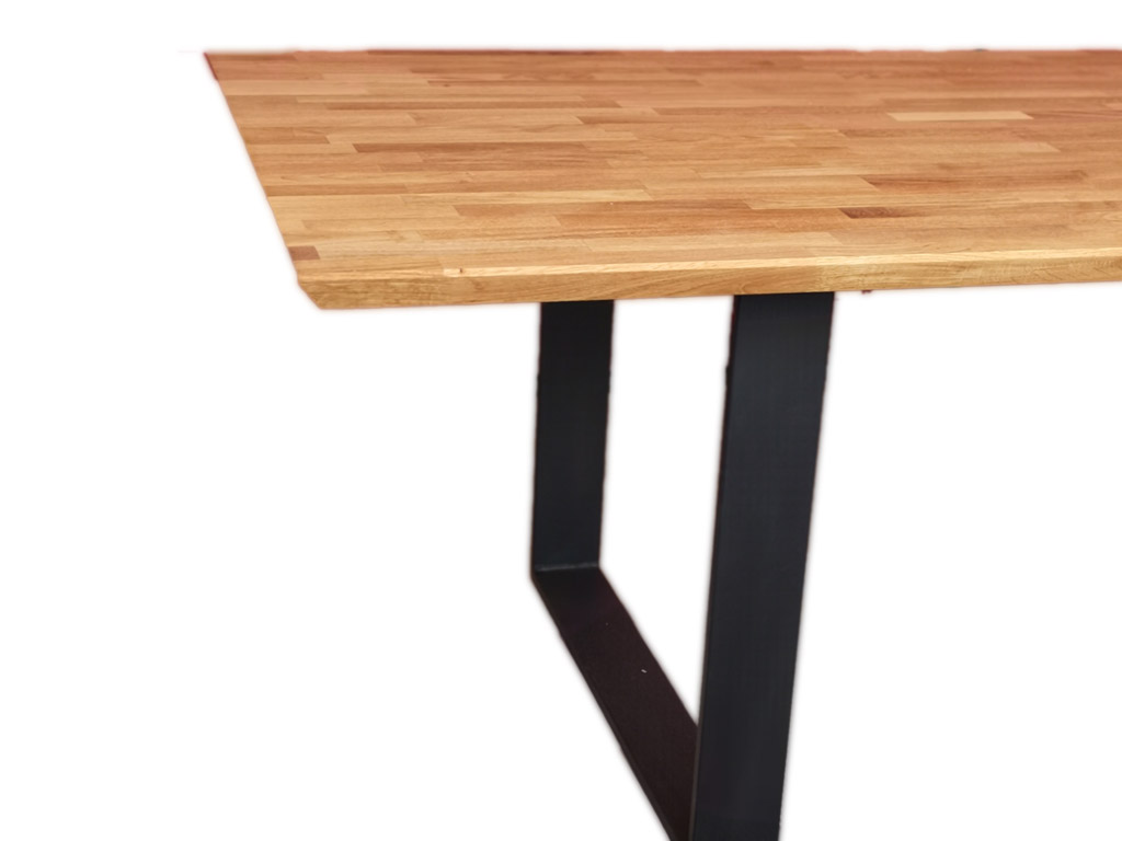 Masivna jedilna miza iz lepljene plošče hrast dolžinsko – širinski spoj. DImenzijsko izredno stabilna plošča zagotavlja dolgo življensko dobo mize tudi v prostorih, kjer se vlaga in temperatura bolj spreminjajo.