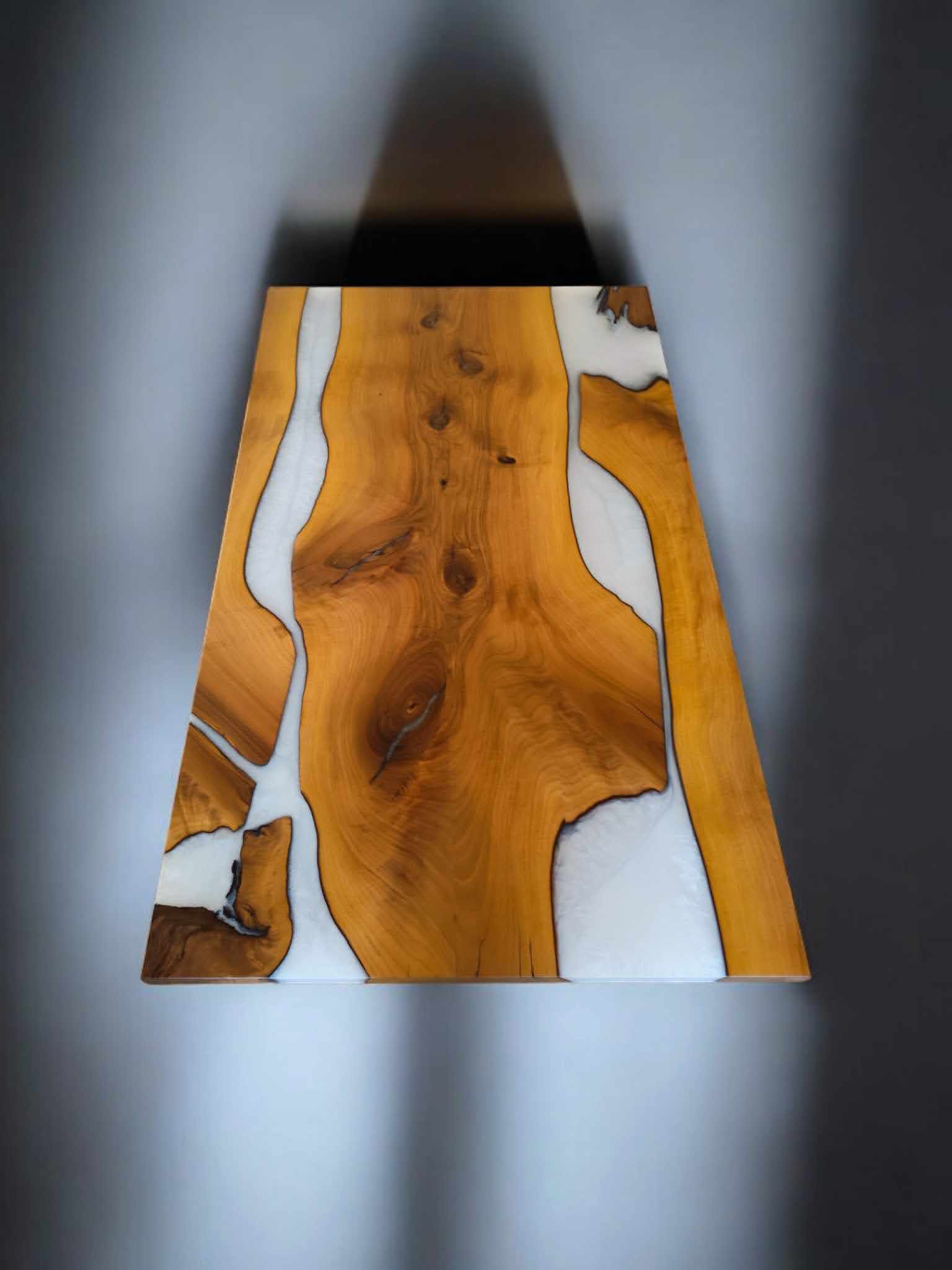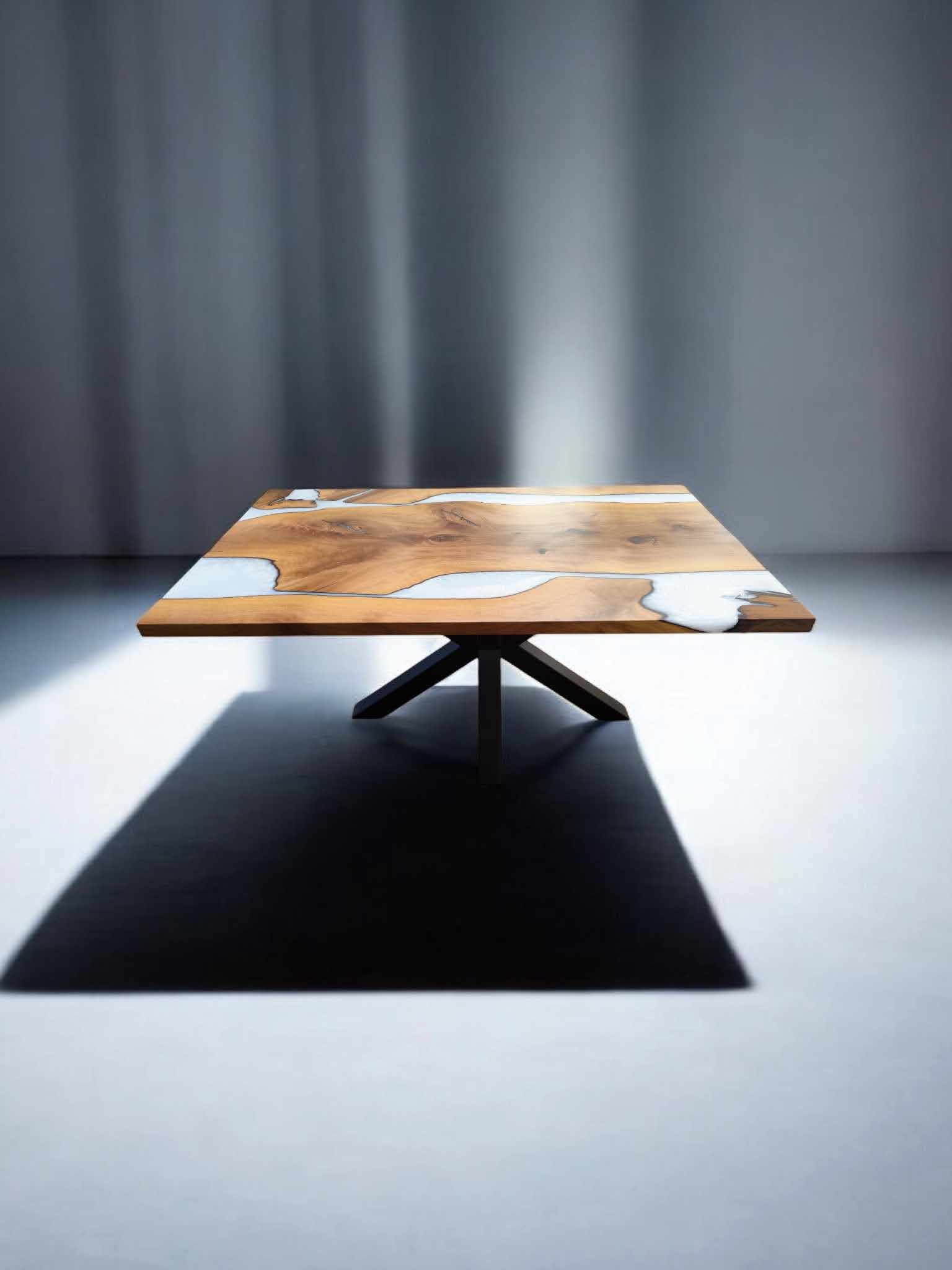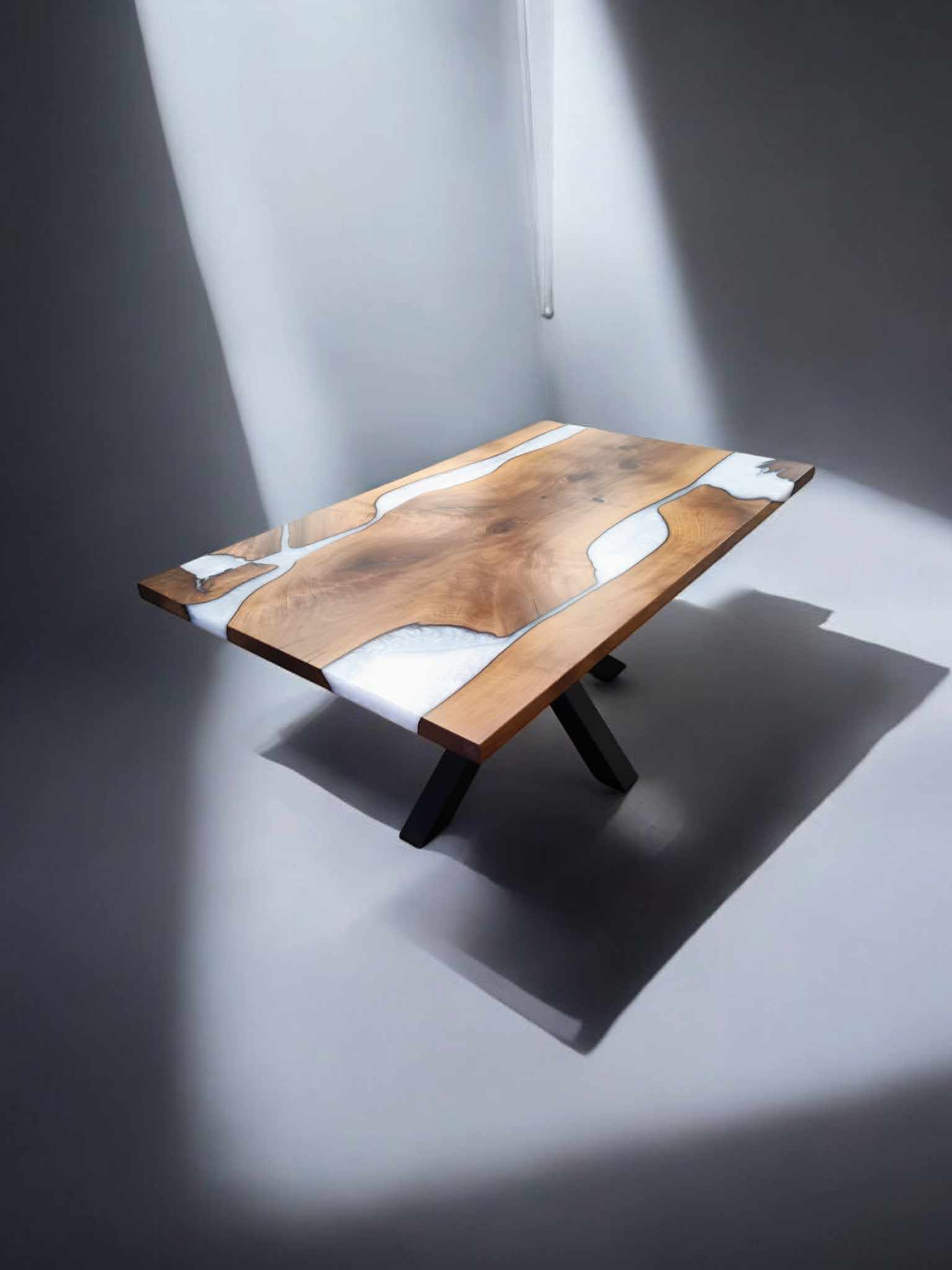 Masivna jedilna miza iz lepljene plošče evropski oreh z dodatkom epoksi smole.