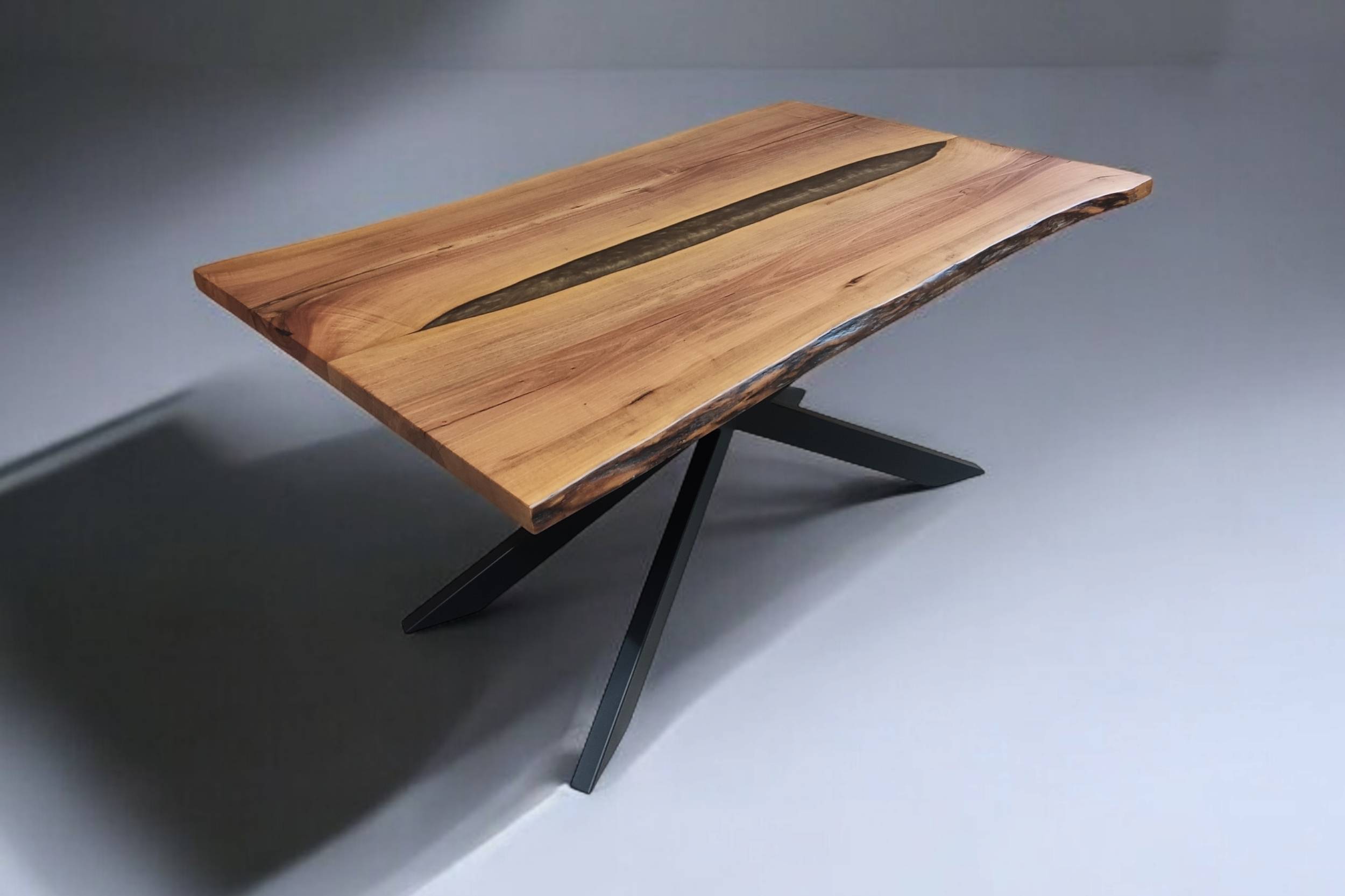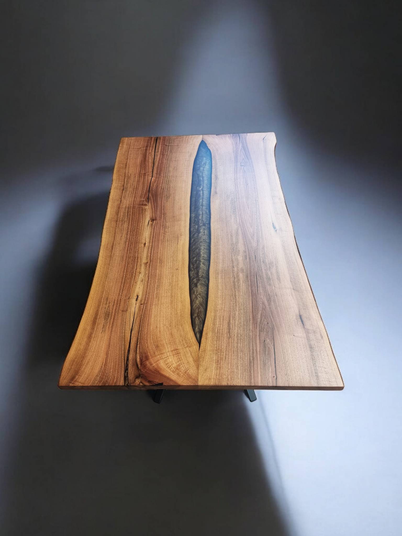 Masivna jedilna miza iz lepljene plošče evropski oreh z dodatkom epoksi smole.