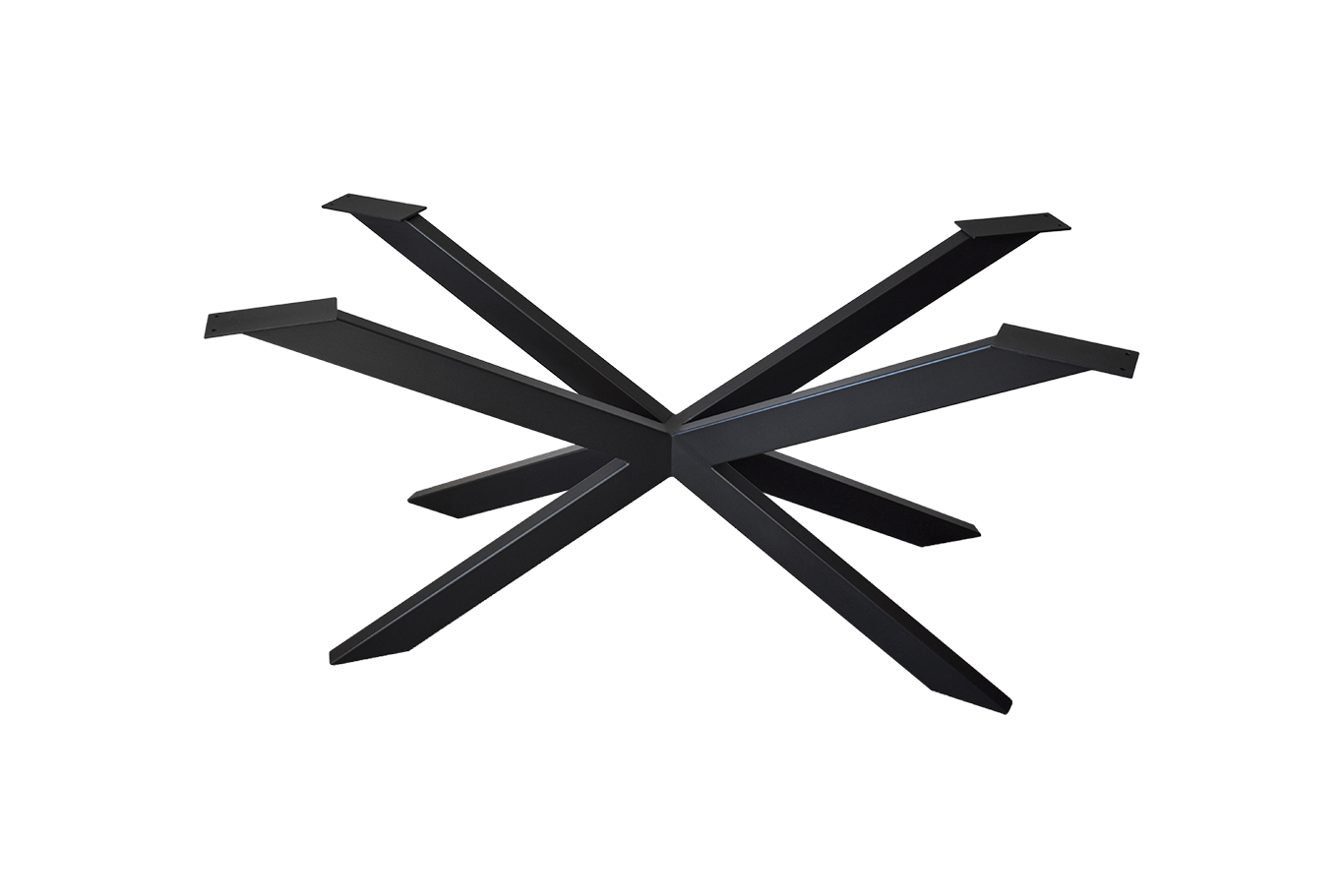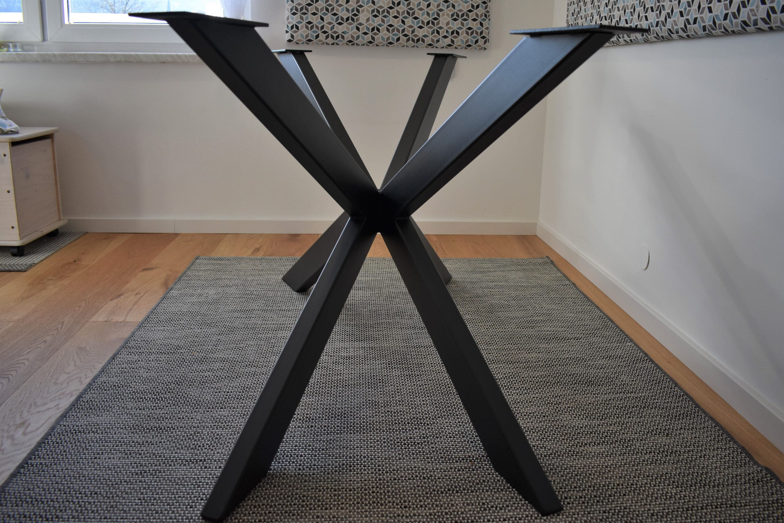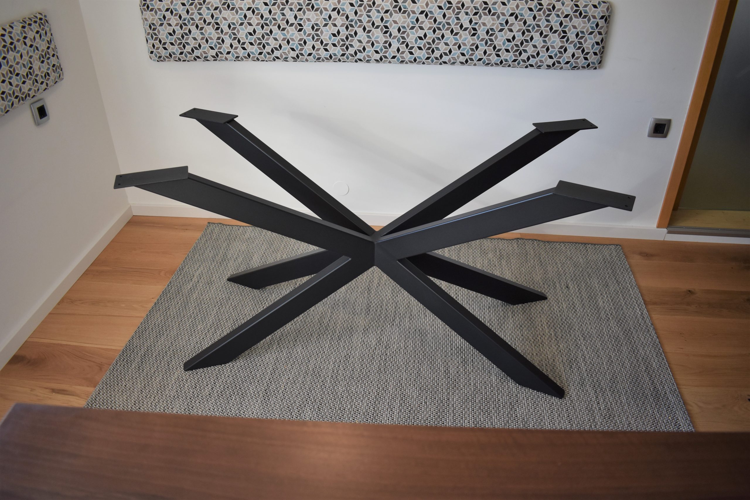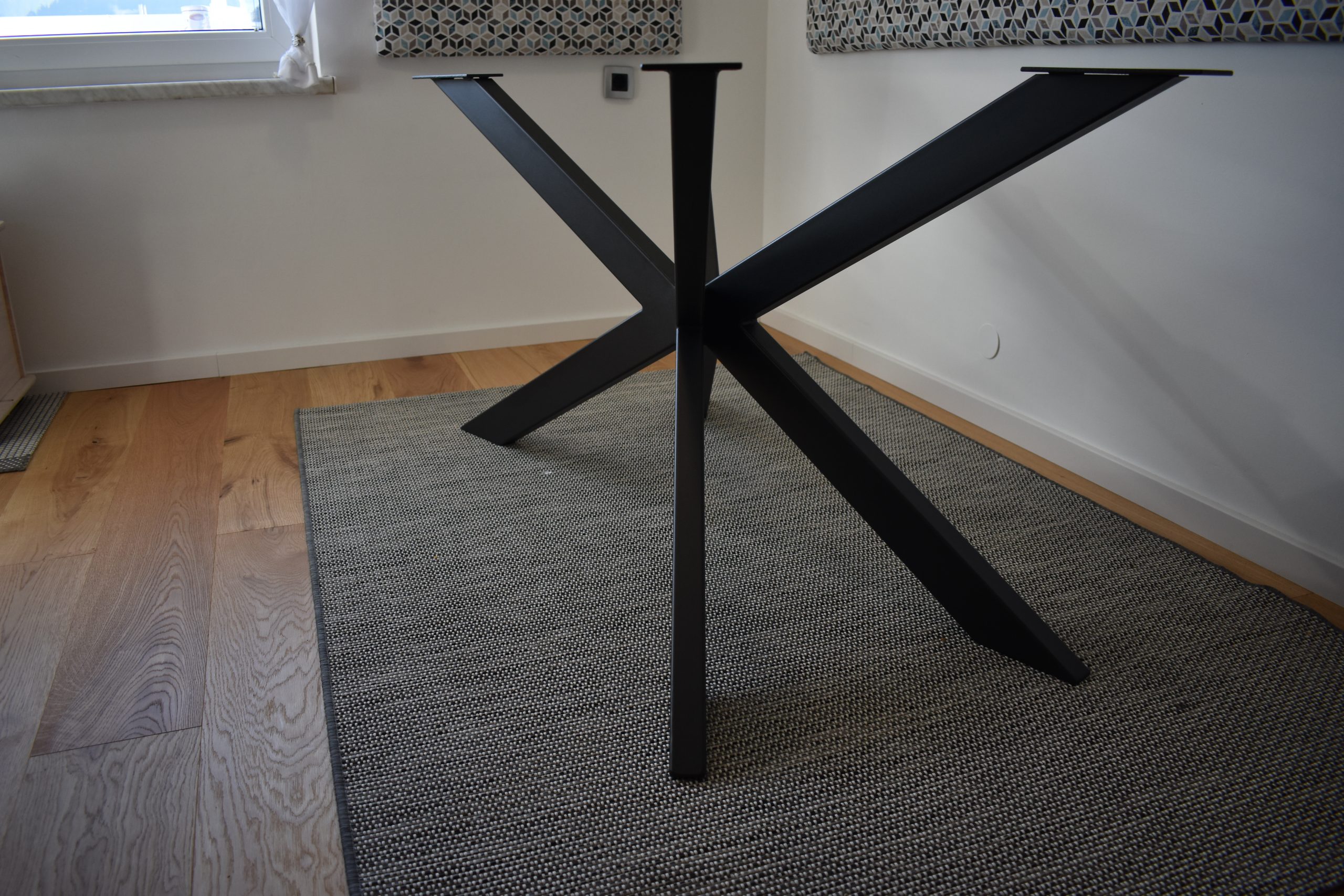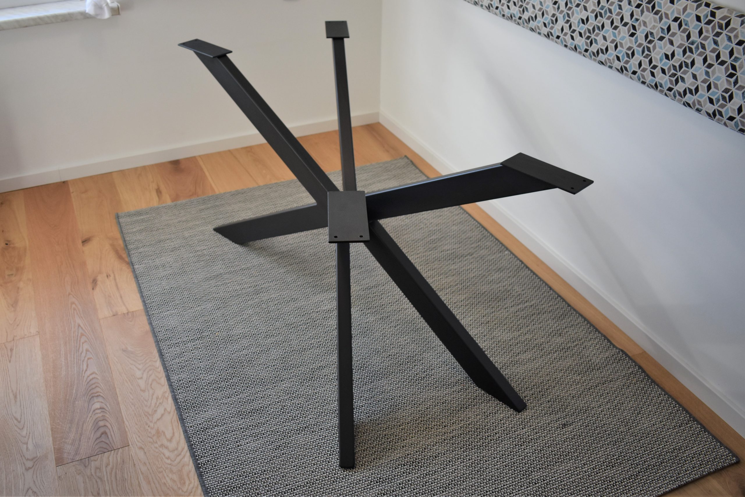 Untergestell für Esstisch aus Metall, lasergeschnitten, hochwertig verschweißt und mattschwarz pulverbeschichtet.